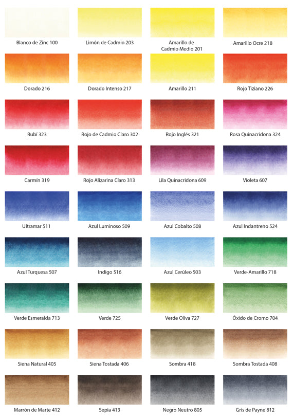Estas pinturas son producidas a partir de pigmentos finamente pulverizados mezclados con goma arábiga como principal aglutinante. Los colores se caracterizan por su alta intensidad, cuyo tono no se pierde aún después de diluir las acuarelas con bastante de agua. Ello se debe a la calidad y alta concentración de pigmentos -la mayoría de los colores son mono-pigmento- así como a su fina molienda y dispersión uniforme.