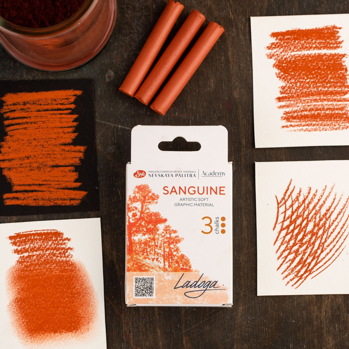 Sanguina y sepia para trabajos artísticos sobre papel, ideal para sombreado. Se difumina fácilmente sobre la superficie del papel. Para realizar correcciones al dibujo, se retira de la superficie del papel con una goma de borrar. Para el almacenamiento a largo plazo, la obra terminada requiere una fijación adicional.