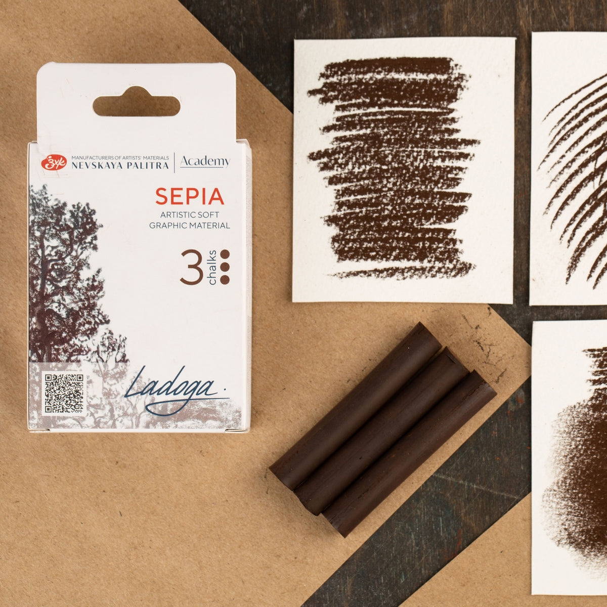 Sepia para trabajos artísticos sobre papel, ideal para sombreado. Se difumina fácilmente sobre la superficie del papel. Para realizar correcciones al dibujo, se retira de la superficie del papel con una goma de borrar. Para el almacenamiento a largo plazo, la obra terminada requiere una fijación adicional.