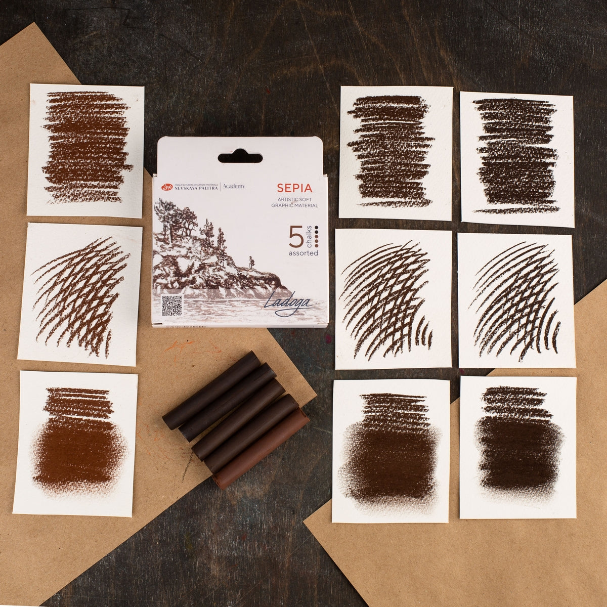 Sepia para trabajos artísticos sobre papel, ideal para sombreado. Se difumina fácilmente sobre la superficie del papel. Para realizar correcciones al dibujo, se retira de la superficie del papel con una goma de borrar. Para el almacenamiento a largo plazo, la obra terminada requiere una fijación adicional.